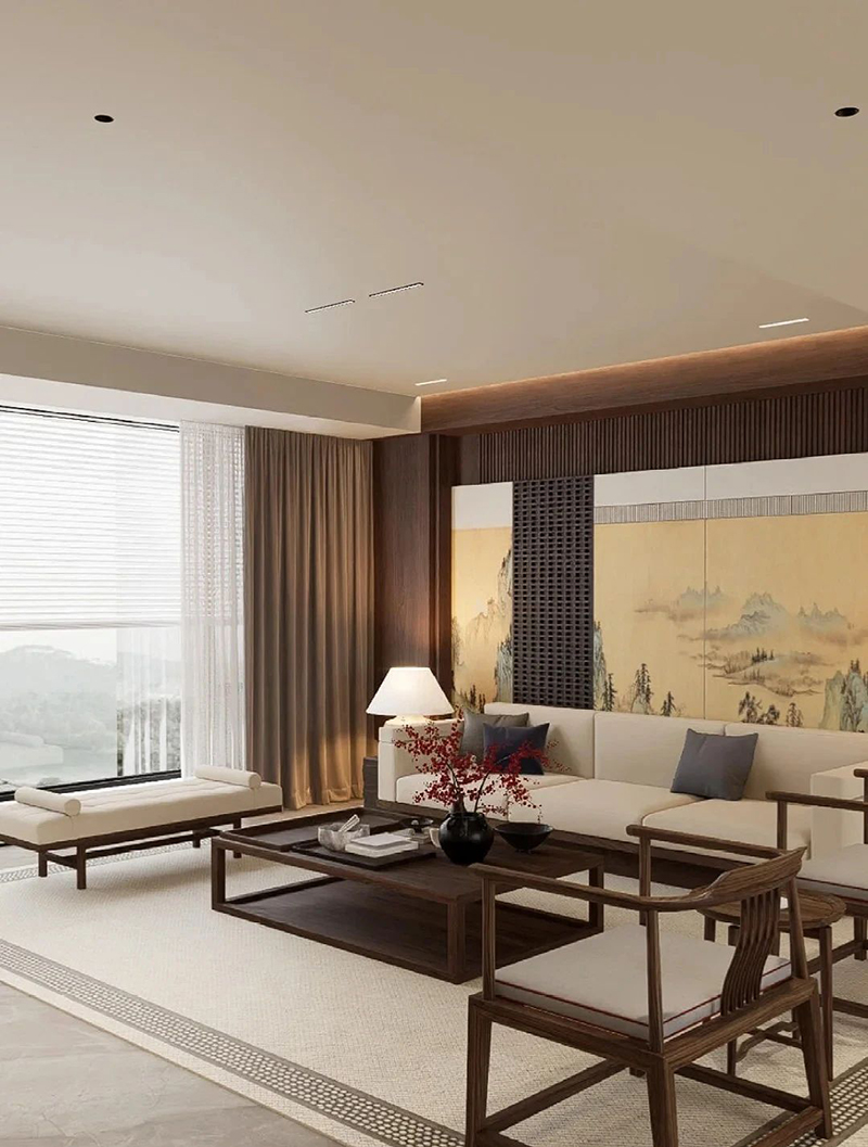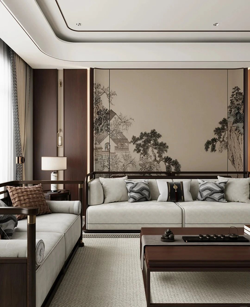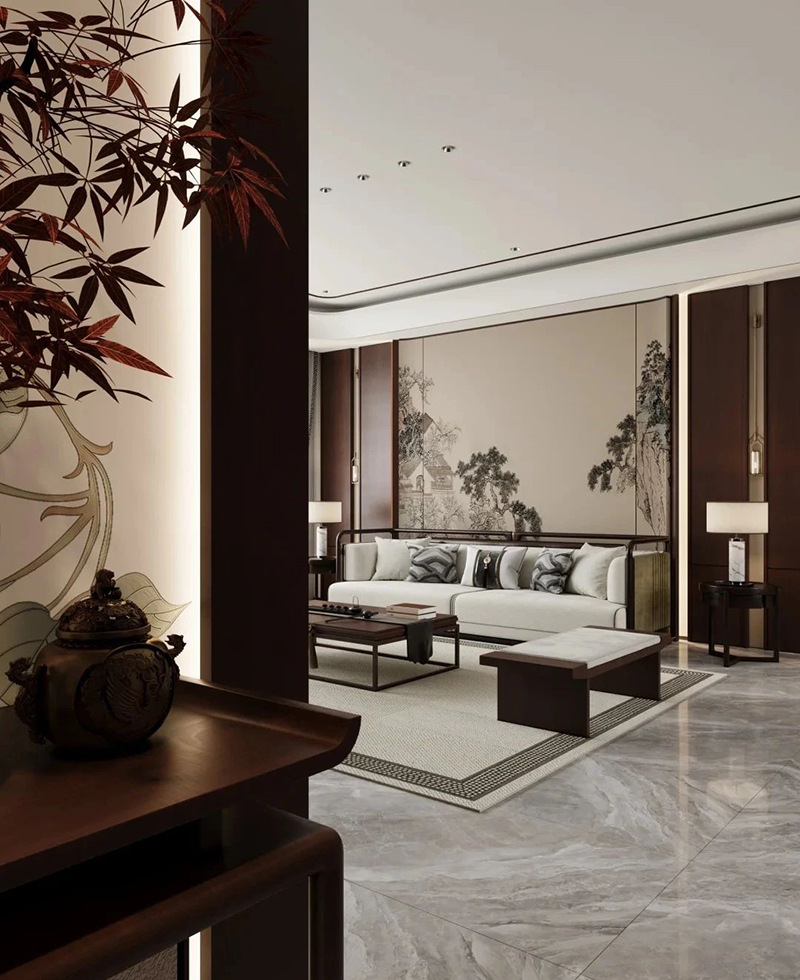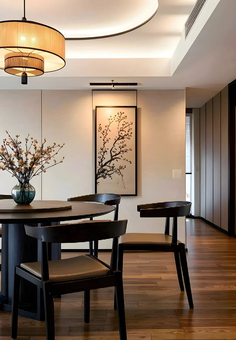 1.新中式:含蓄的东方韵味北美胡桃木与新中式堪称灵魂搭档。深胡桃木色的家具搭配乌木棕餐边柜,再加以水墨画装饰,诠释“留白”意境。