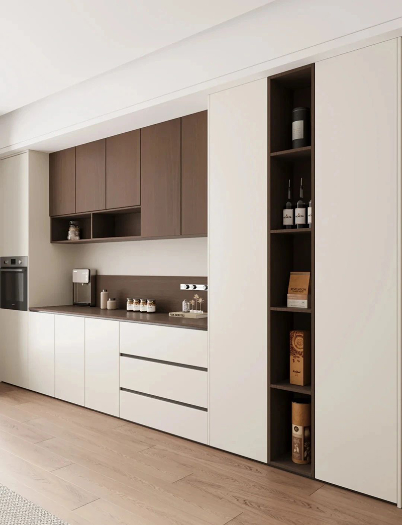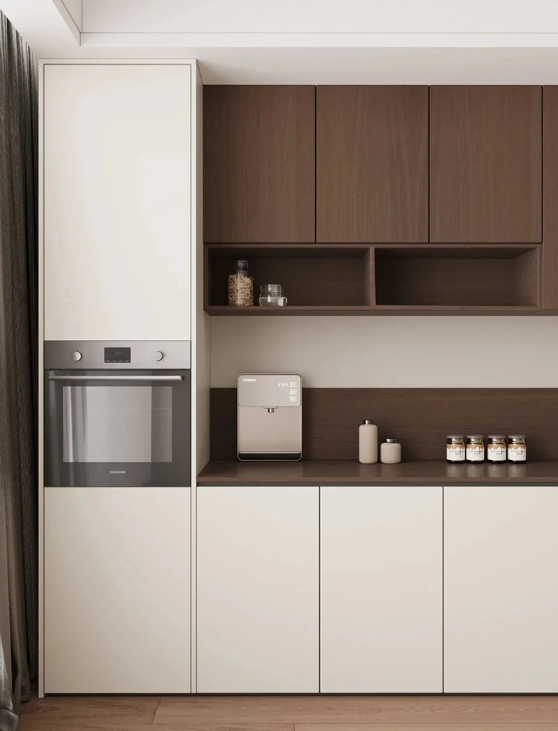 2.现代简约:自然与克制的平衡胡桃木在现代简约风格中常以“点睛之笔”出现。深色胡桃木餐桌搭配纯白岩板台面,定制柜可搭配黑胡桃骨骼线条,立体感拉满,既能突出材质的天然肌理,又通过线条的简洁性弱化厚重感。